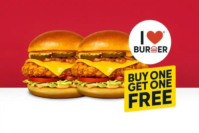 Poulet frit façon Louisiane, cheddar fondant, salade croquante, pickles acidulés et mayo Sriracha relevée. Croustillant et tendre à chaque bouchée… Profitez vite de l’offre 1 burger acheté = 1 burger offert, disponible pour une durée limitée.